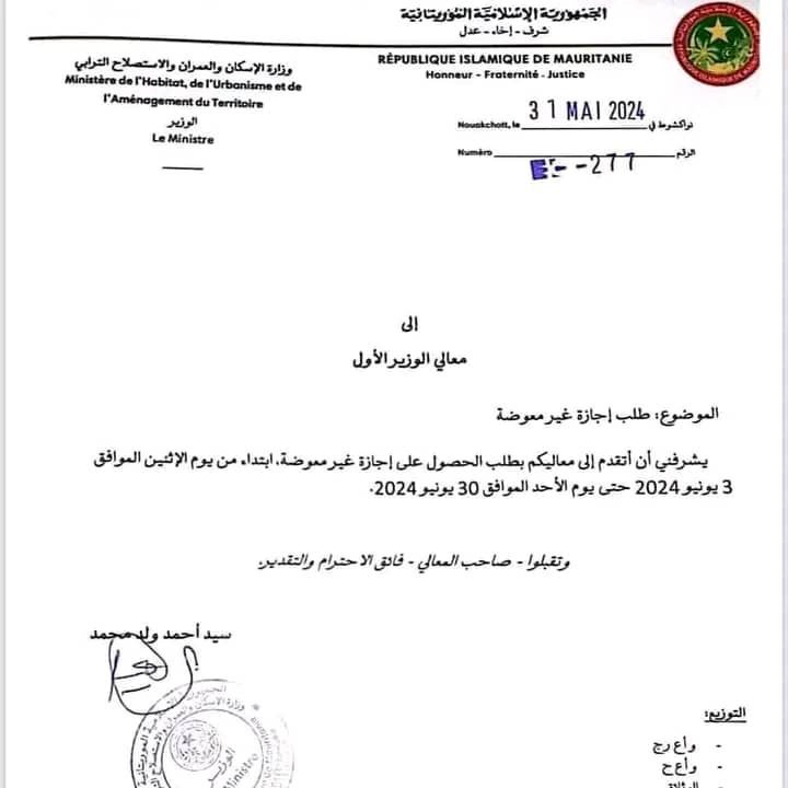 طالب وزير الإسكان والعمران والاستصلاح الترابي سيد أحمد ولد محمد، الوزير الأول محمد ولد بلال بمنحه إجازة غير معوضة خلال الحملة الانتخابية.